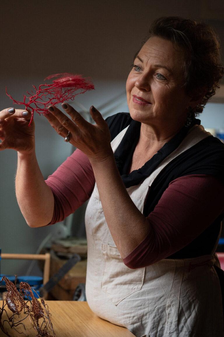 Tributaries explores the fibres of flora, fauna, and human systems. It includes jewellery, small fine metal sculptures, and objects formed by corrosion casting, a process by which resin is injected into animal organs and other biological systems to form moulds of internal spaces.
